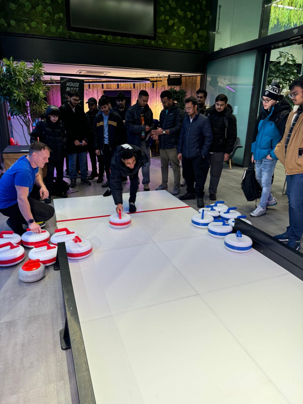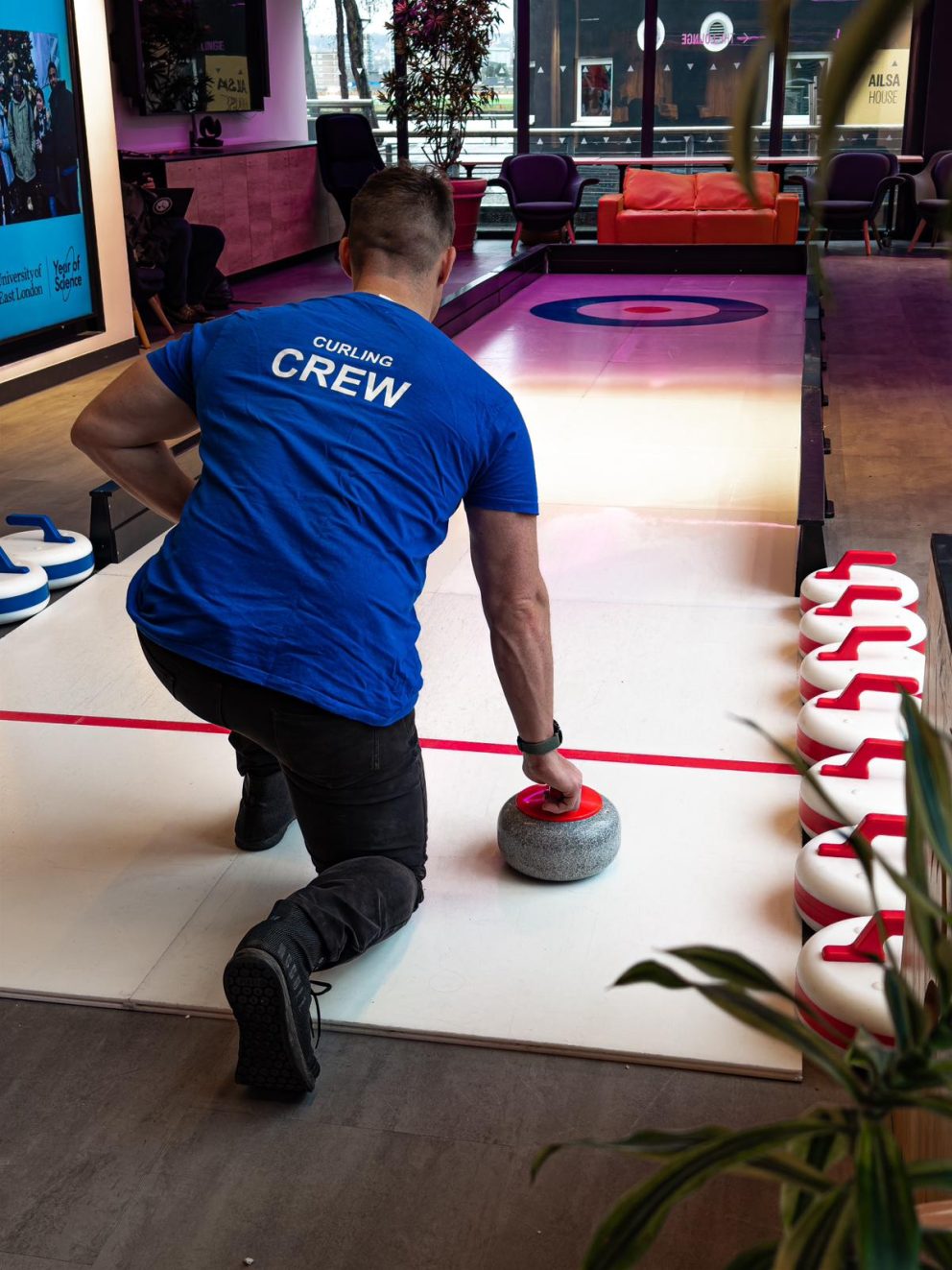 Floor curling is designed to be flexible and venue-friendly. A standard lane typically requires around 10 metres in length and 2 metres wide, but we can adapt layouts to suit smaller or unusually shaped spaces. Sports halls, hotel function rooms, offices, conference centres and even large marquees all work well. If you’re unsure, share your venue details with us, and we’ll advise on the best setup to maximise gameplay and flow.